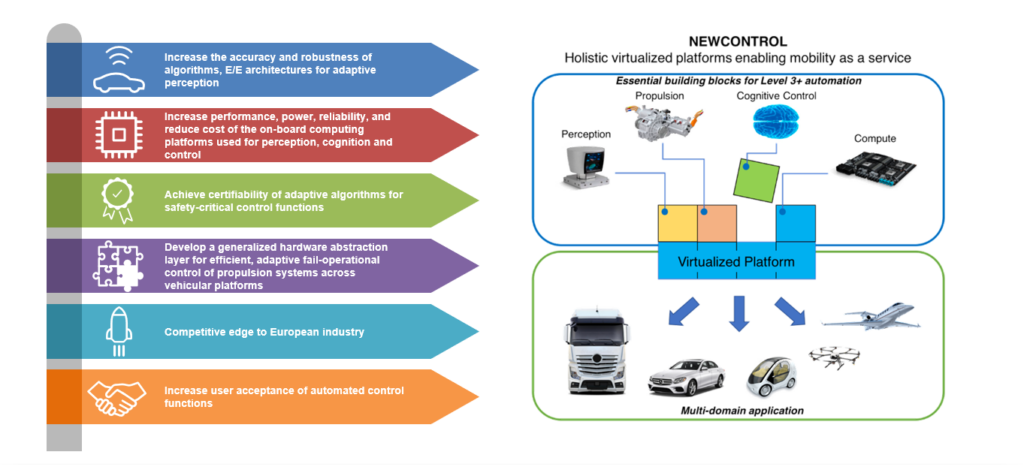 If we summarize the overall operation of an autonomous vehicle in one or two phrases, perhaps this would be that we want the vehicle to sense, to think and learn, to act and decide, and finally to communicate and be connected with the user in an acceptable, safe, and enjoyable way. Aligned with the above description, the NewControl project will strive until the end of 2022 to deliver fail-operational holistic virtualized platforms for vehicular subsystems that are critical to automated driving (SAE Levels 3+), enabling mobility-as-a-service for next-generation highly automated vehicles. OEMs of Tier-1 and Tier-2 from semiconductor and automotive industry are collaboratively working for the realization of intelligent vehicular building blocks that will be demonstrated in perception systems, in decision making and control systems, invalidation, certification and qualification as well in a demonstrator examining the user acceptance and trust in automated driving functions. The overview of NewControl and the main targets are depicted in Figure 1. These targets will be fulfilled via the 11 demonstrators inside NewControl.
