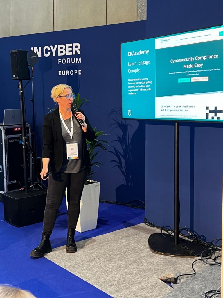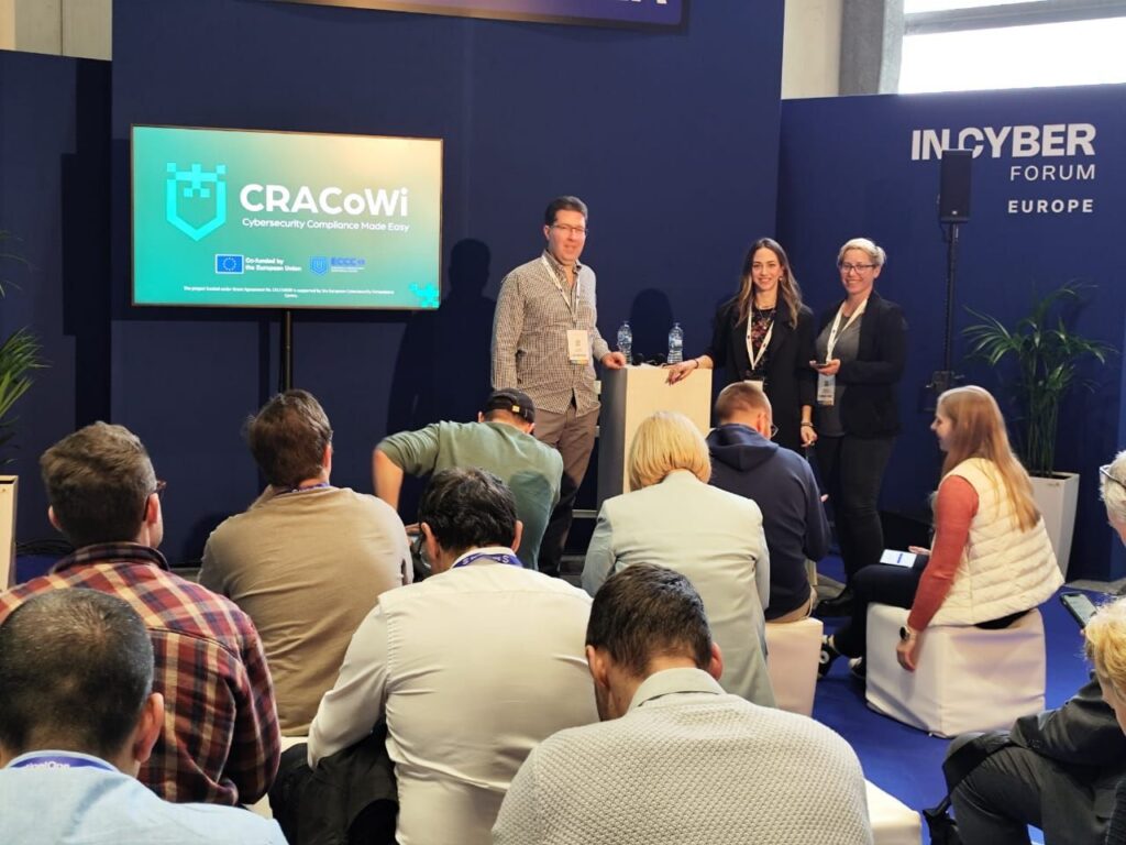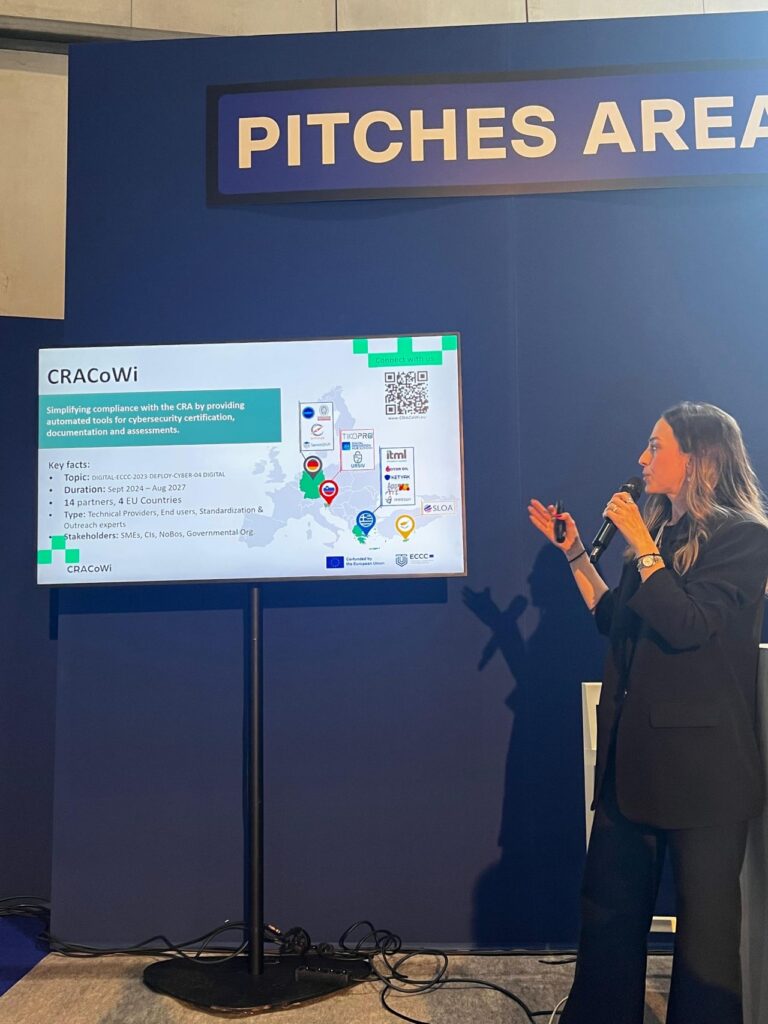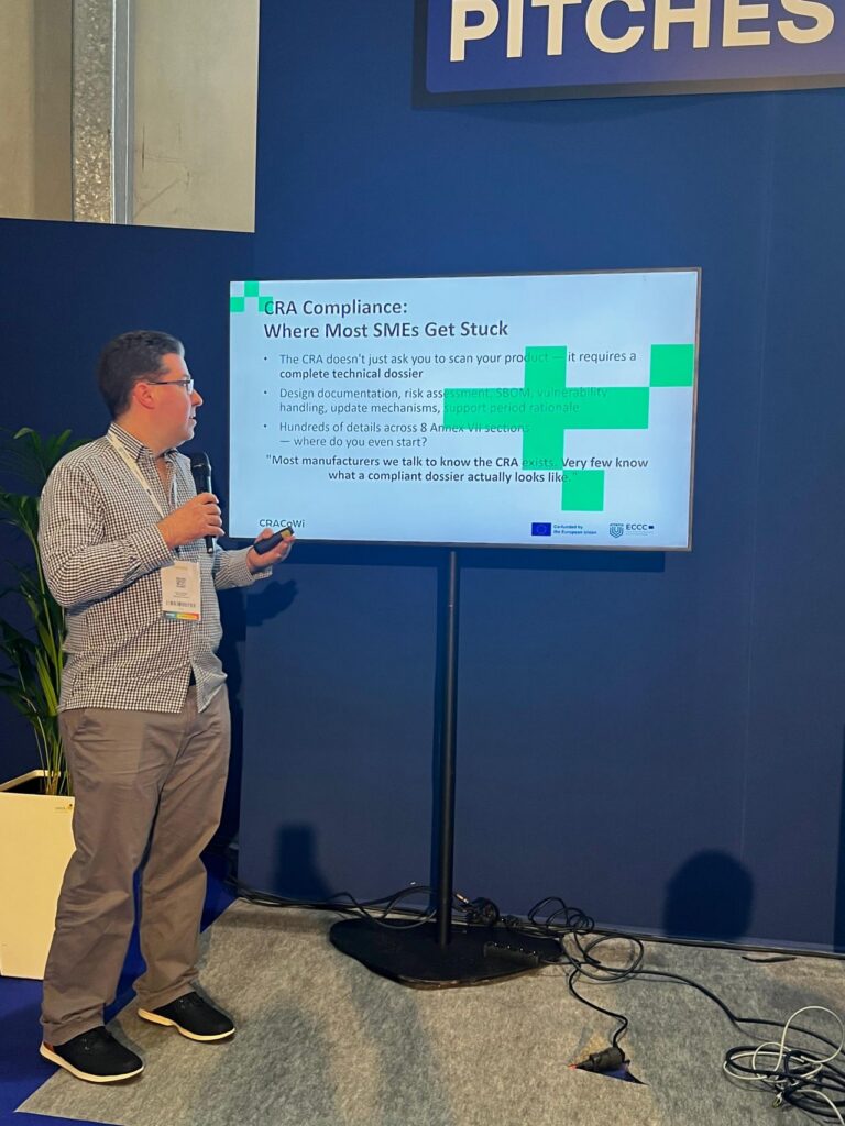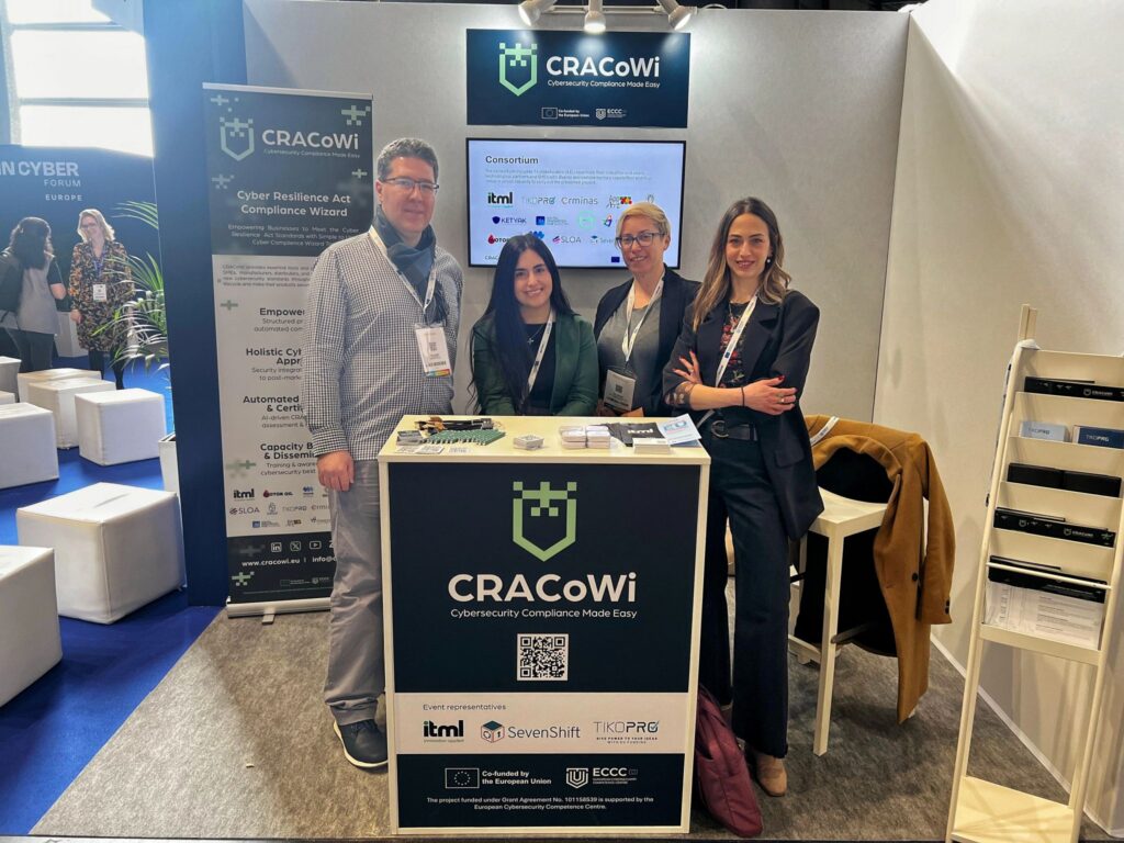 As coordinator of the CRACoWi project, ITML had a strong presence with two dedicated presentation slots delivered together with partners Tiko Pro and SevenShift in the EU Pavilion pitch area. The sessions, “Empowering businesses to meet the Cyber Resilience Act standards with the CRACoWi tool” and “Is the CRA Coming for Your Product? A Practical Compliance Walkthrough”, focused on raising awareness around the Cyber Resilience Act (CRA), as well as providing a more technical walkthrough of the upcoming CRACoWi tool to support organizations in understanding and addressing its requirements